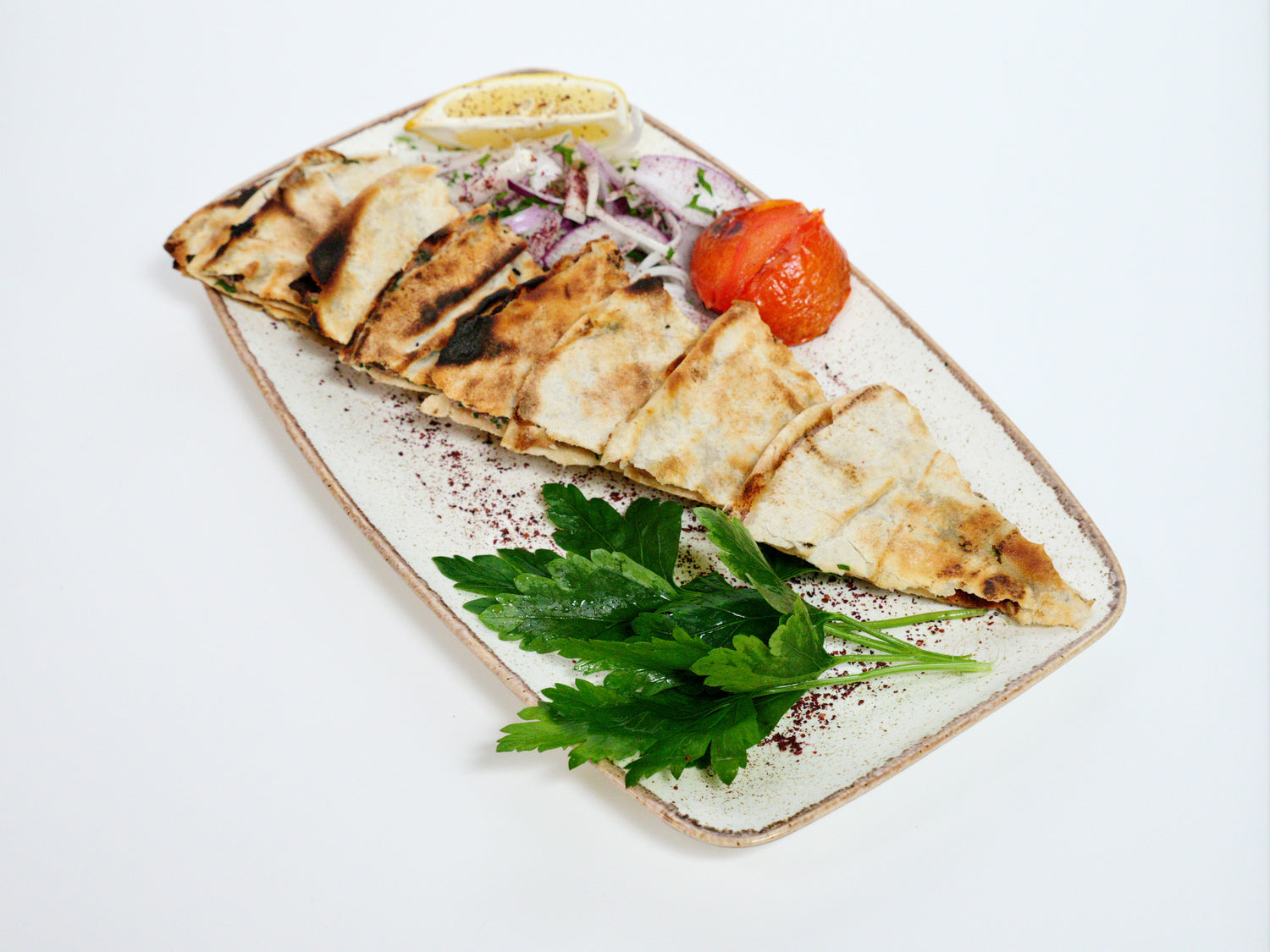 Succulent shredded lamb with Middle Eastern spices, accompanied by grilled tomato and garlic pita.