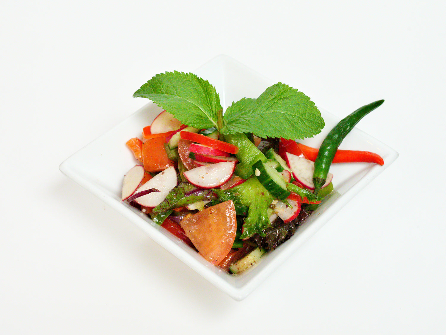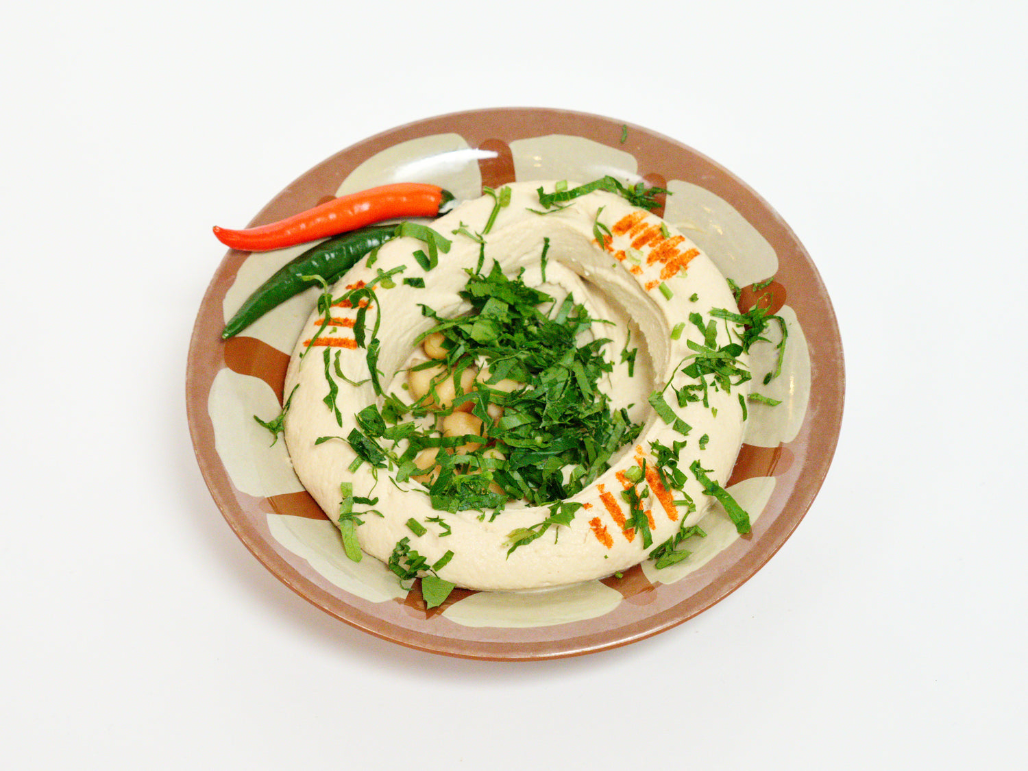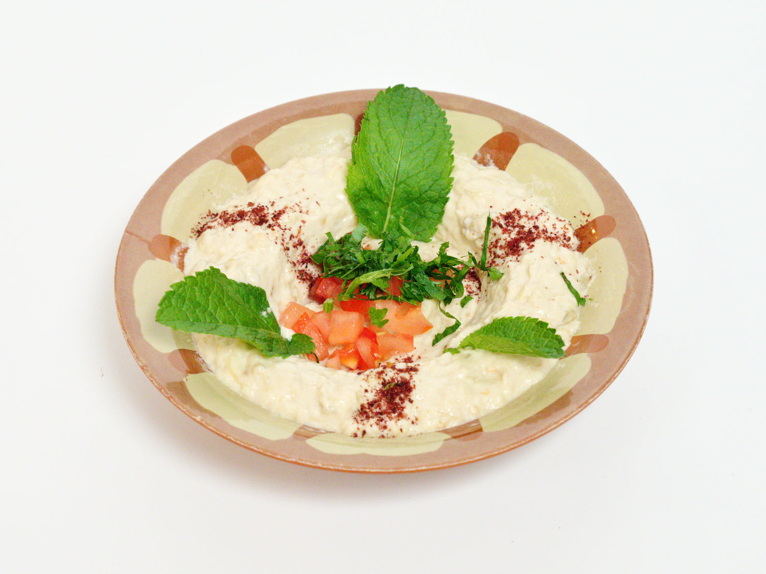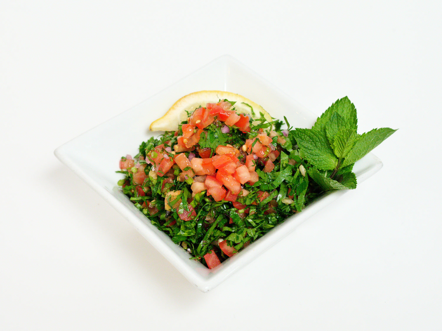 Selection of hummus, baba ganouj, tabboulé, waraq anab, and saksuka.