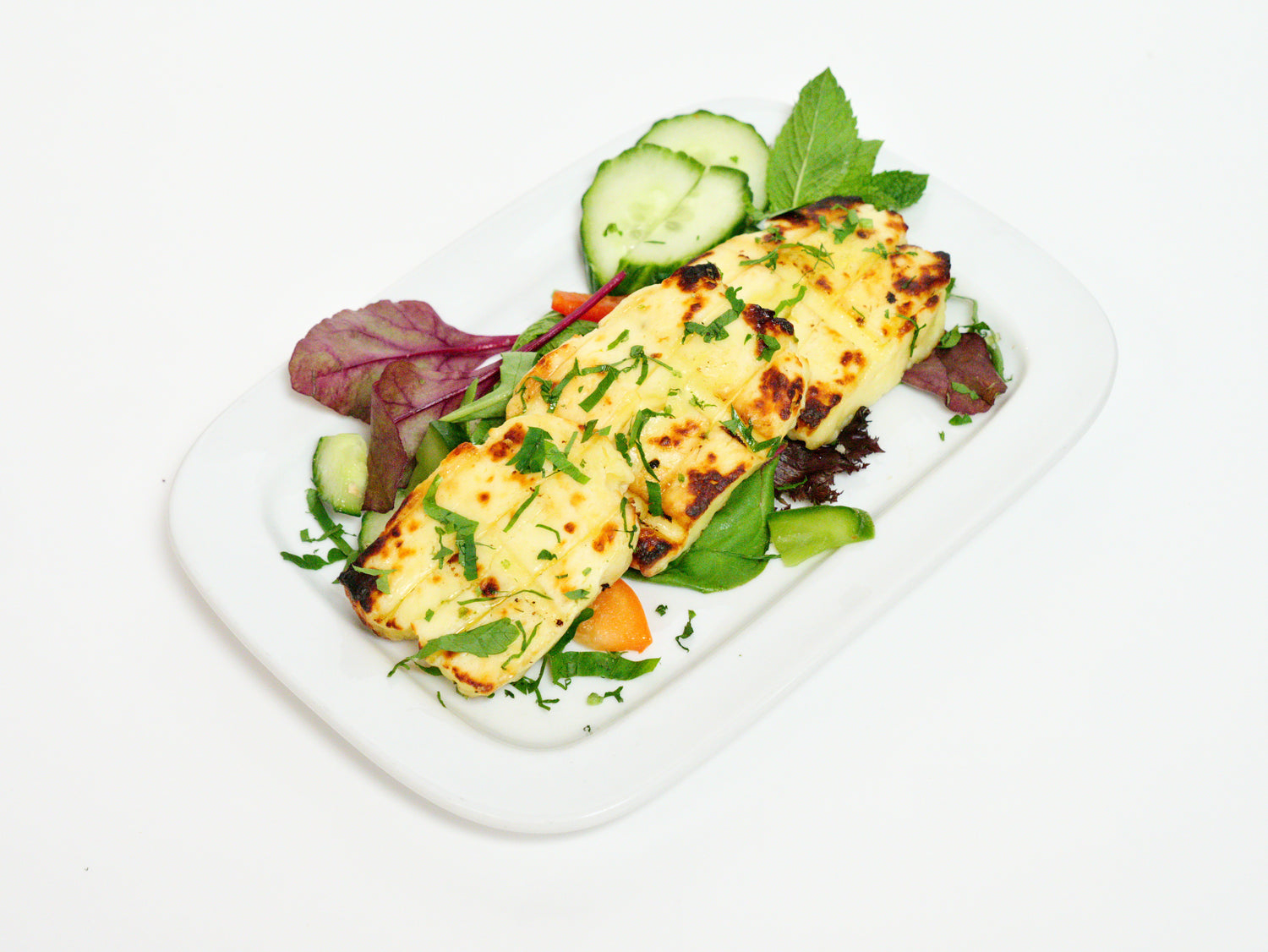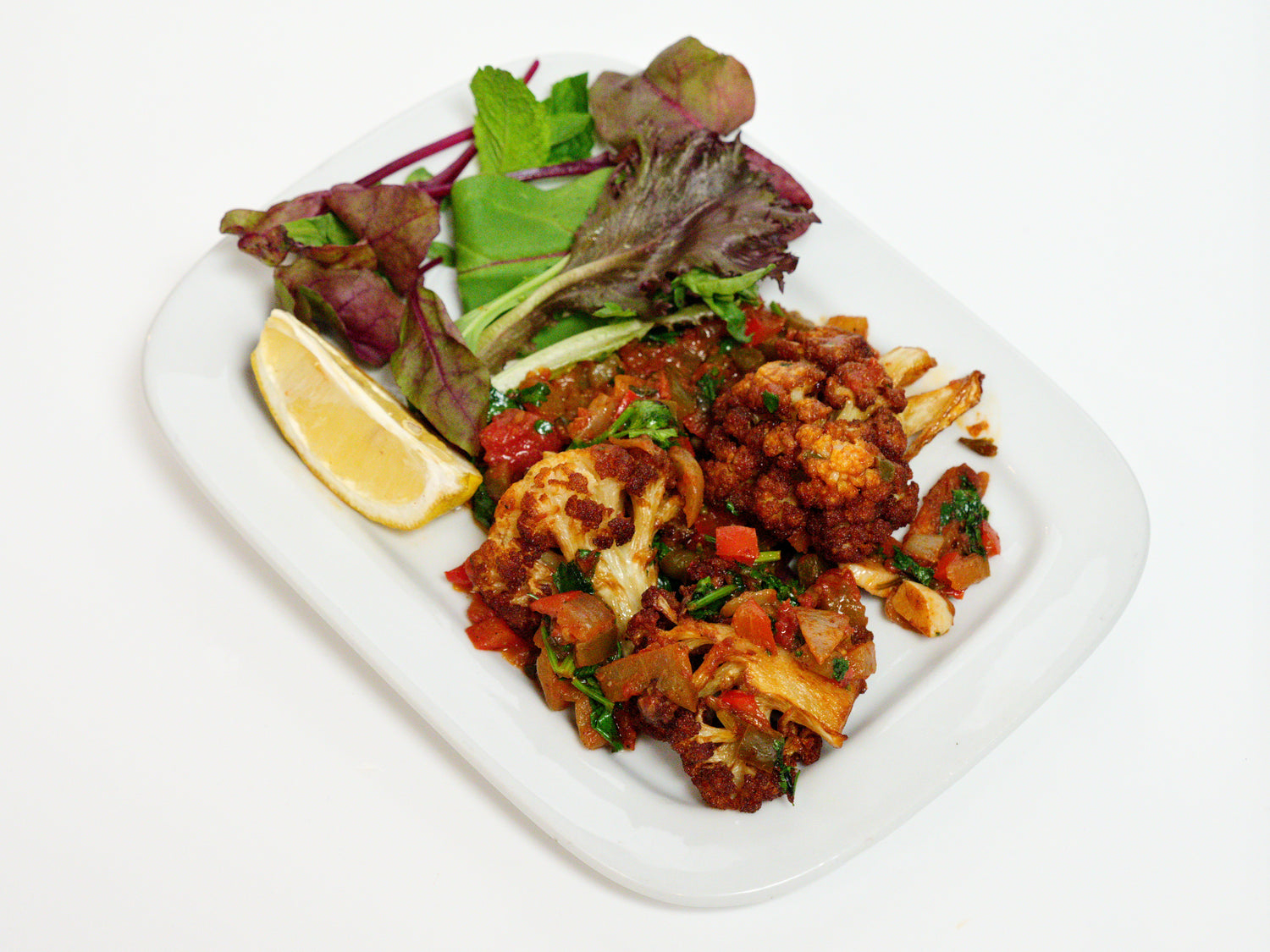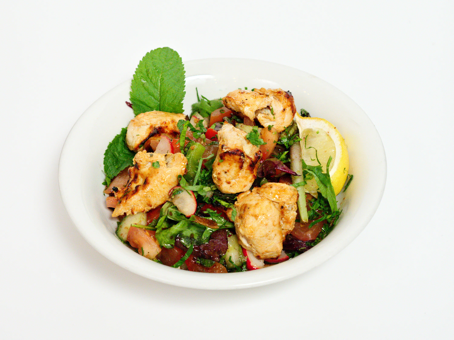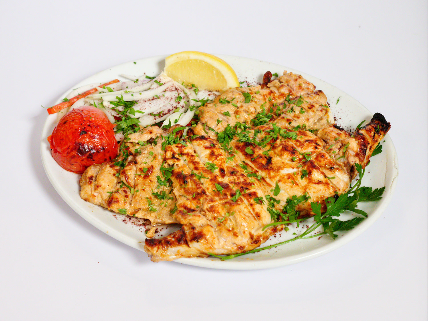 Tender shredded chicken marinated in aromatic spices, served with grilled tomato and garlic pita bread.