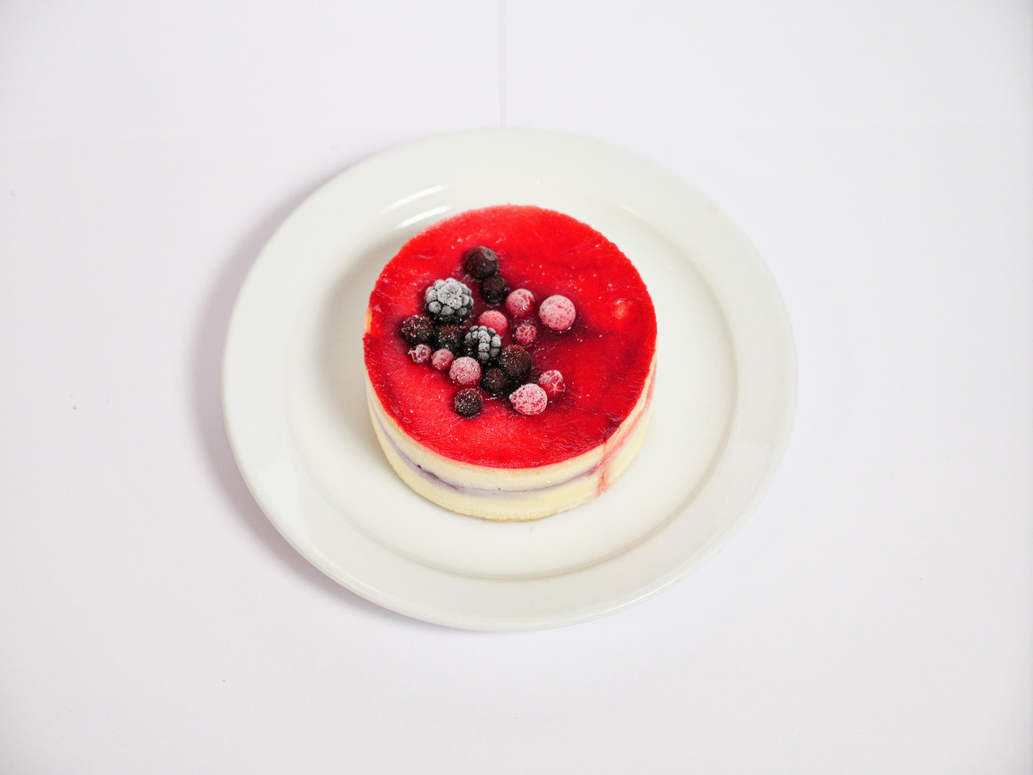 Italian-style vanilla bavarois with raspberry glaze, fresh berries, and buttery biscuit base.