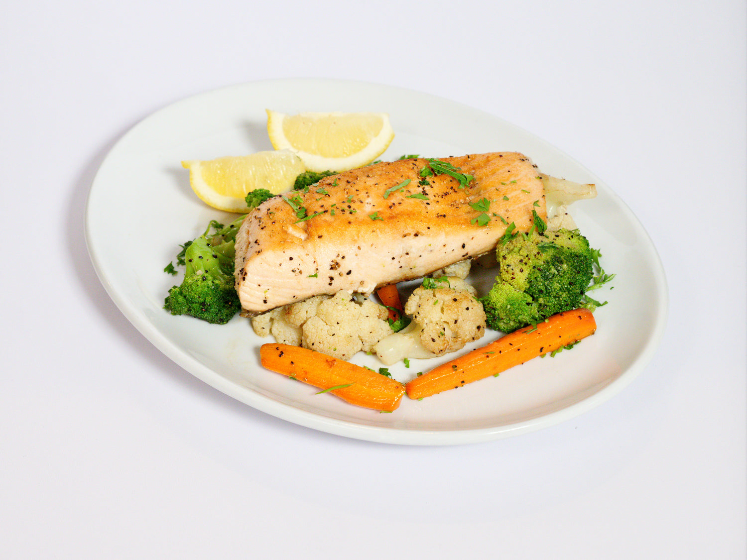 Salmon fillet marinated in lemon and olive oil, served with sautéed seasonal vegetables.
