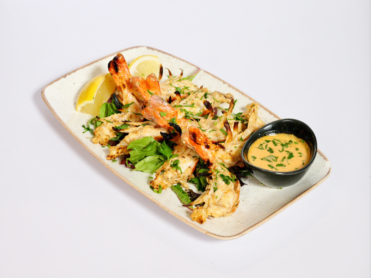 Large, succulent shrimp grilled with spices and served with rice and mild sauce.