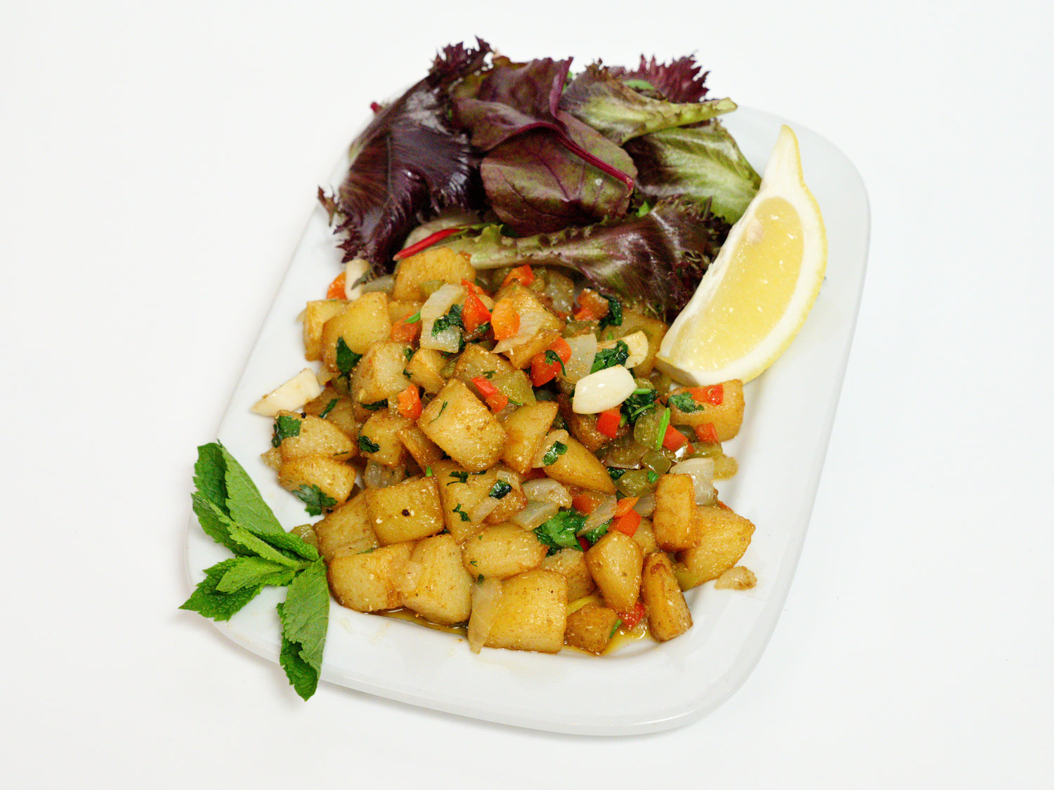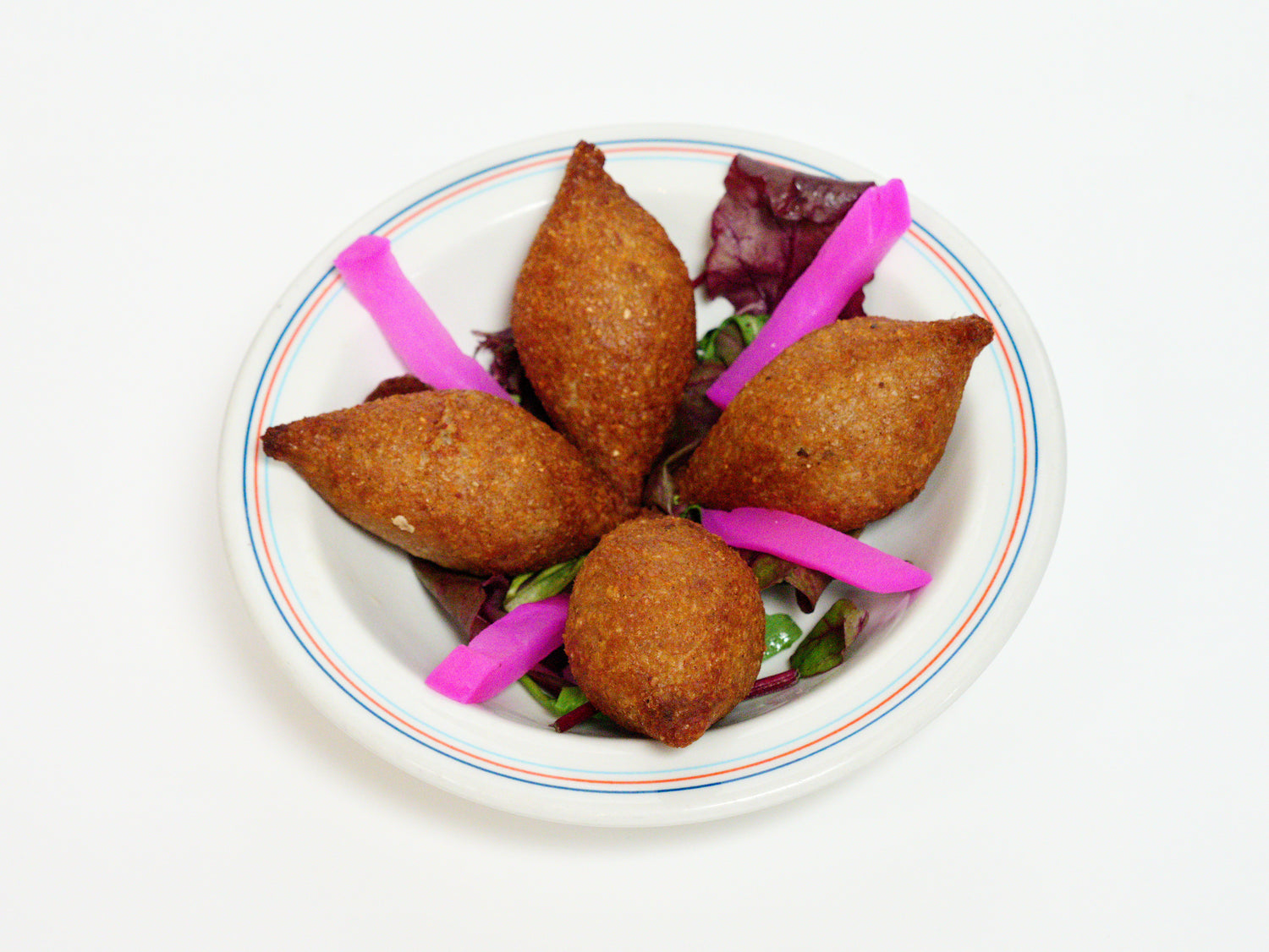 A selection of Kibbeh, Falafel, Cheese Boregi, Lamb Boregi, Spicy Potatoes, and Soujouk.